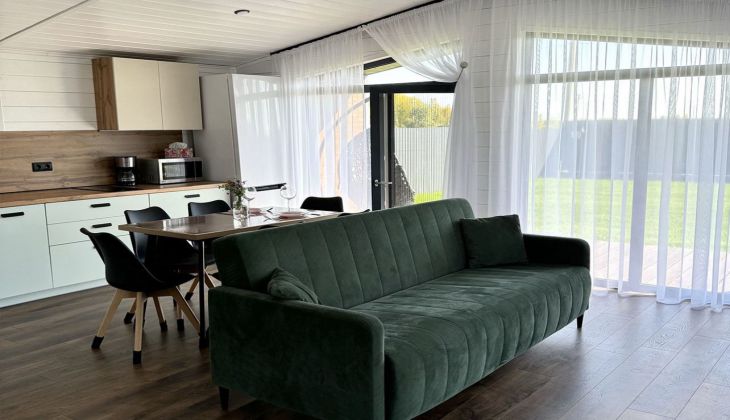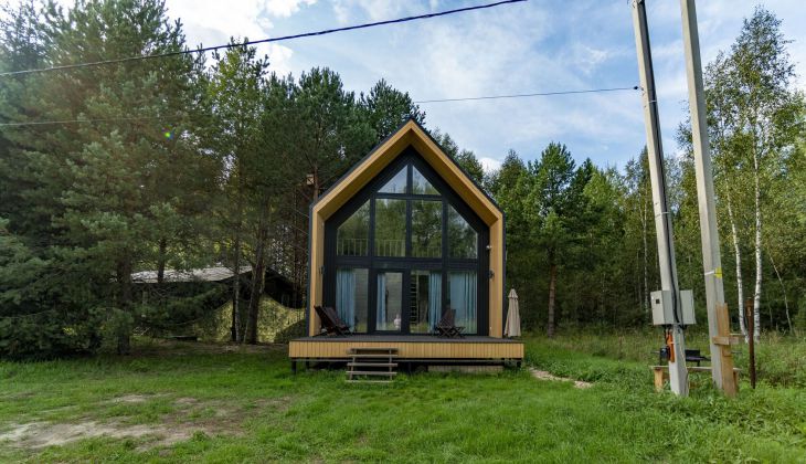 BARN 50 — дом для семьи из 2-3х человек. Дом, в котором есть всё, и нет ничего лишнего. Отдельная спальня на первом этаже, санузел. Кухня-гостиная с высоким потолком и панорамным остеклением. Санузел с душевой кабиной. Лофт-антресоль на 2 спальных места и зона хранения вещей. По сравнению с популярным BARN-50 мы переработали задний фасад и лестницу, увеличили спальню.